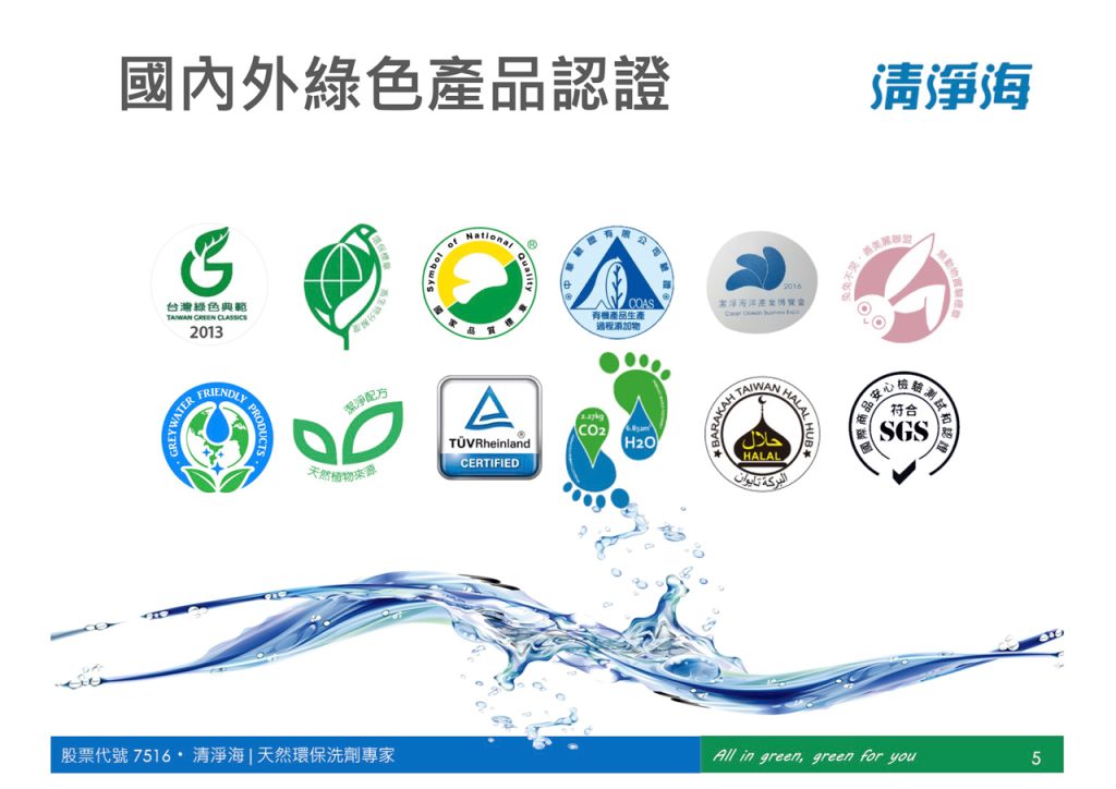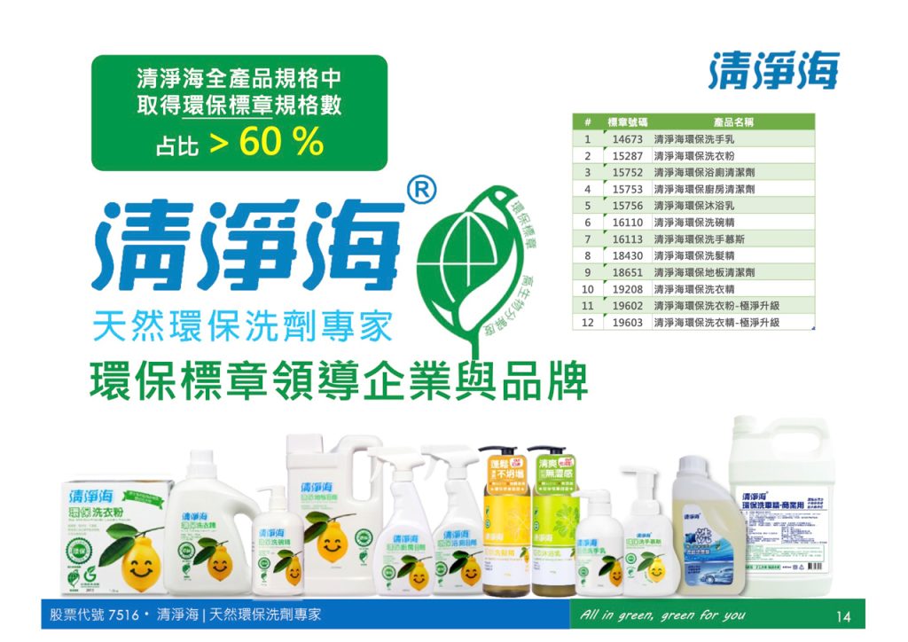 - 品牌介紹: 「愛地球、做環保」不是一句口號,但單價高是推廣環保產品困難的主要原因,清淨海生技累積多年製程經驗,優化並降低製造成本,以平易的價格回饋給消費者,現在到全聯、大潤發、家樂福、屈臣氏、康是美…等各大通路,買得到清淨海生技的環保標章洗衣精/洗衣粉,是目前通路布局最廣的環保洗劑品牌。 清淨海生技已連續取得20+年的國家環保標章,是政府綠色採購的優質供應商,在許多公家機關裡能看到清淨海生技的環保洗手乳。因為要讓大眾在生活周遭中看得到、用得到,環保才有意義!