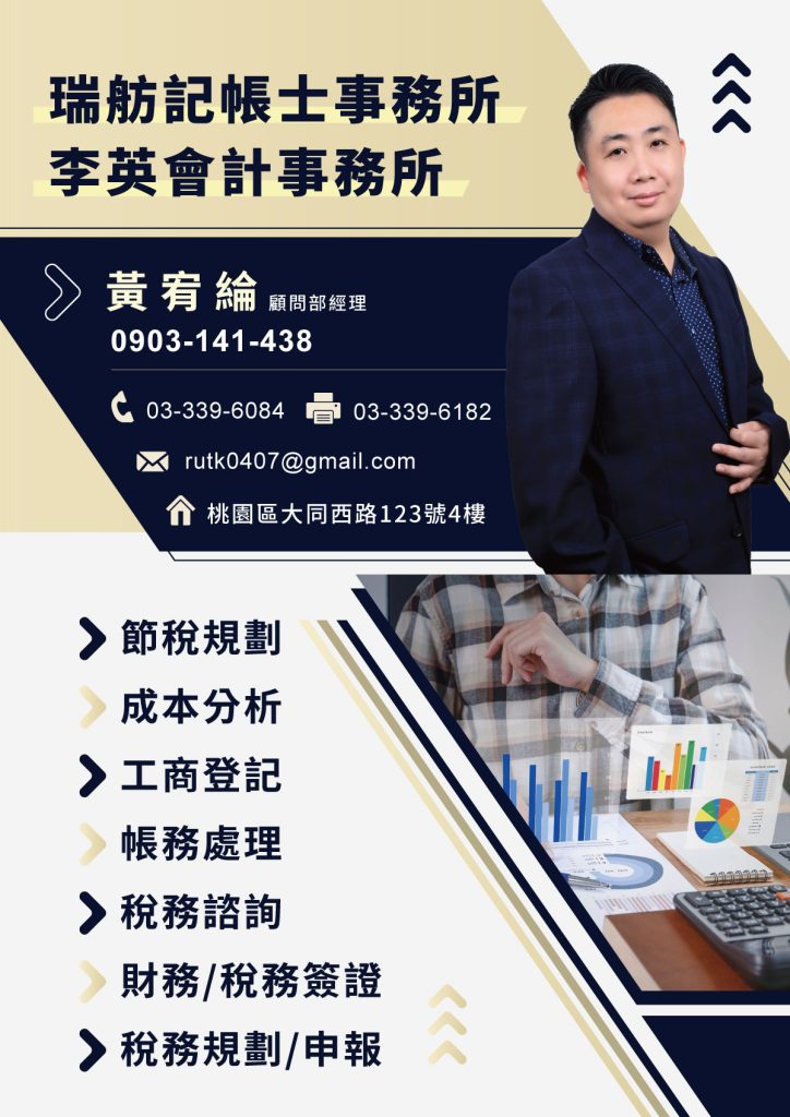 黃宥綸 李英會計事務所 營業項目: 節稅規劃/成本分析/工商登記/帳務處理/稅務諮詢/財務、稅務簽證/稅務規劃、申報 品牌介紹: 以提升客戶之經營效率為宗旨,並促進會計界整體之良性競爭及服務品質之提昇,使事務所不斷地成長進步。我們擁有堅持專業經營的理念,秉持顧客至上,不斷提昇客戶服務品質 , 並且確實實踐。 電話:03-339-6084 手機:0903-141-438 地址:桃園區大同西路123號4樓 信箱:rutk0407 LINE: